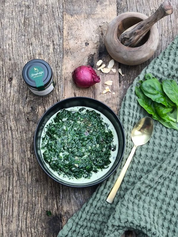 Spinat zugeben, mit Stampfkartoffel Genuss Salz würzen und mit dem Mehl bestreuen, nochmals kurz andünsten.